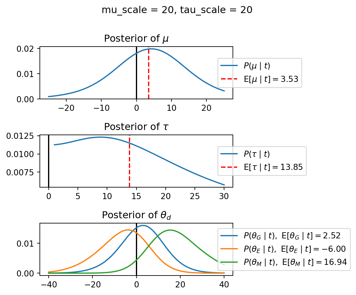Try changing the data to t = jnp.array([-20, -10, 30]). Notice how changing the data for one group updates the expectation of the population.