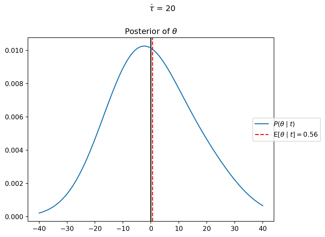 %reset -fimport jaximport jax.numpy as jnpfrom memo import memofrom enum import IntEnumfrom jax.scipy.stats.norm import pdf as normpdffrom jax.scipy.stats.cauchy import pdf as cauchypdffrom matplotlib import pyplot as pltnormpdfjit = jax.jit(normpdf)class Department(IntEnum): GOVERNMENT =0 ENGLISH =1 MATH =2t = jnp.array([1, -15, 30])sigma =15Theta = jnp.linspace(-40, 40, 200)@jax.jitdef professor_arrival_likelihood(d, theta):### likelihood of a professor from department d ### showing up t_d minutes early/late, ### under the hypothesis given by theta and sigma.return normpdf(t[d], theta, sigma)@memodef complete_pooling[ _theta: Theta,](mu=0, tau=1): president: knows(_theta) president: thinks[ department: chooses(d in Department, wpp=1), department: chooses(theta in Theta, wpp=normpdfjit(theta, mu, tau)) ] president: observes_event( wpp=professor_arrival_likelihood(department.d, department.theta))return president[Pr[department.theta == _theta]]mu_ =0tau_ =20res = complete_pooling(mu=mu_, tau=tau_)### check the size and sum of the output# res.shape# res.sum()fig, ax = plt.subplots()ax.axvline(0, color="black", linestyle="-")theta_posterior = restheta_expectation = jnp.dot(Theta, theta_posterior)ax.plot(Theta, theta_posterior, label=r"$P(\theta \mid t)$")ax.axvline( theta_expectation, color='red', linestyle='--', label=(r"$\operatorname{E}"+rf"[\theta \mid t]={theta_expectation:0.2f}$"))_ = ax.set_title(r"Posterior of $\theta$")_ = ax.legend(bbox_to_anchor=(0.9, 0.5), loc='center left')_ = plt.suptitle(fr"$\dot\tau$ = {tau_}", y=1)plt.tight_layout()plt.show()